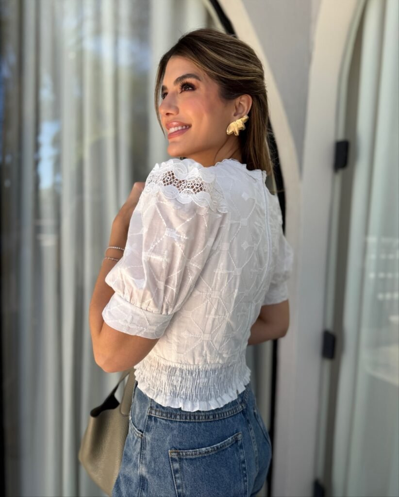 Blusa cropped feminina em laise branca com lastex na barra e manga bufante. Disponivel em P, M, G e GG.