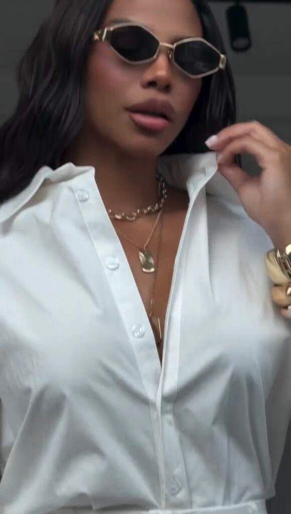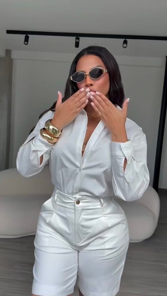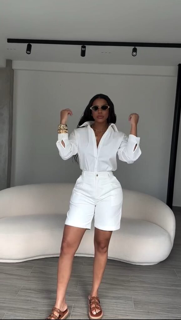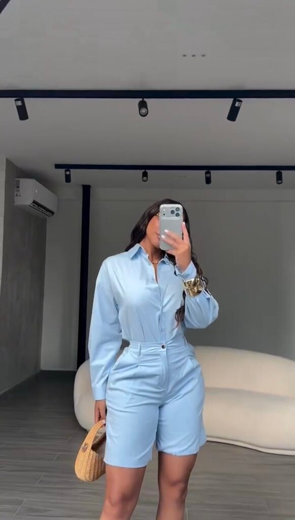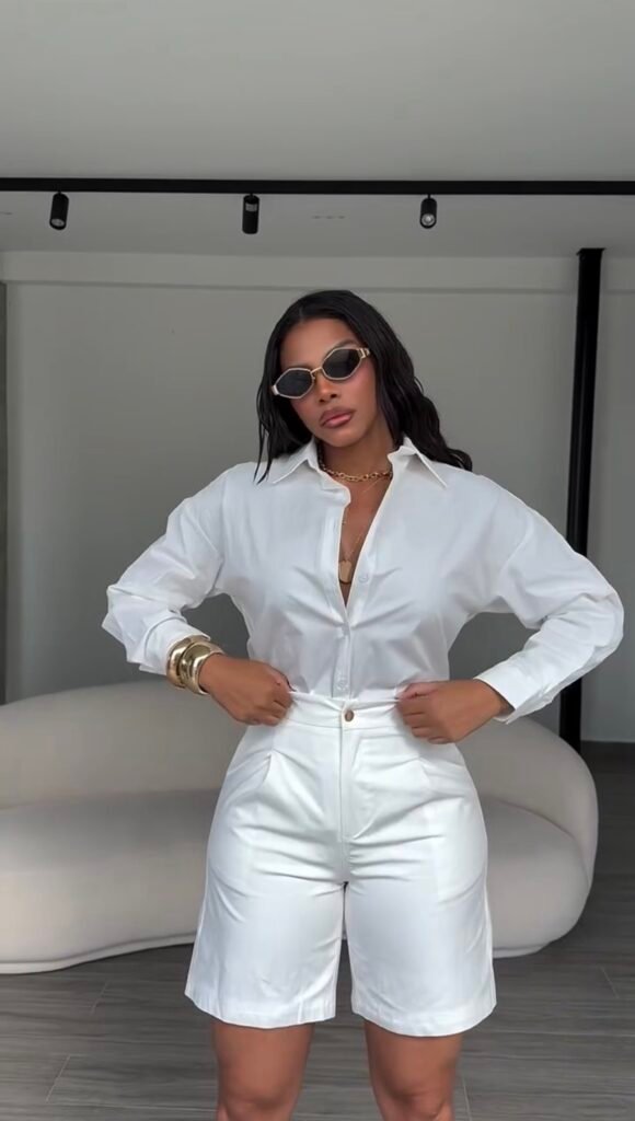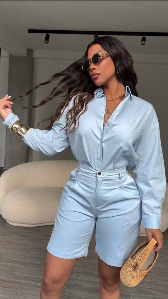 Conjunto bermuda + camisa, modelagem clássica.